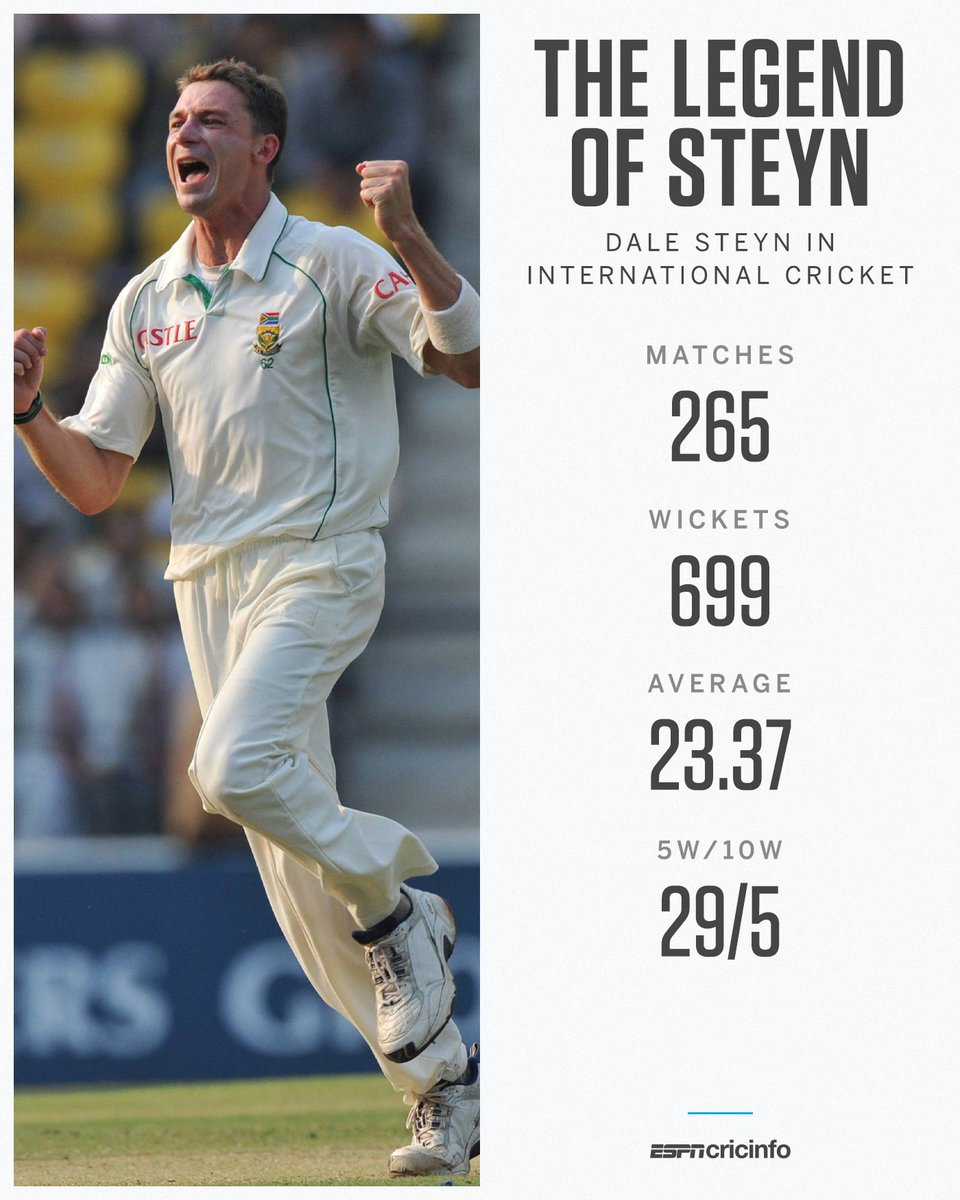Dale Steyn represented South Africa in 93 Tests 125 ODIs and 47 T20Is picking up 439 196 and 64 wickets respectively. South Africa fast-bowling great Dale Steyn announced his retirement from all forms of cricket on Tuesday August 31. De senaste tweetarna från Dale_Steyn_.