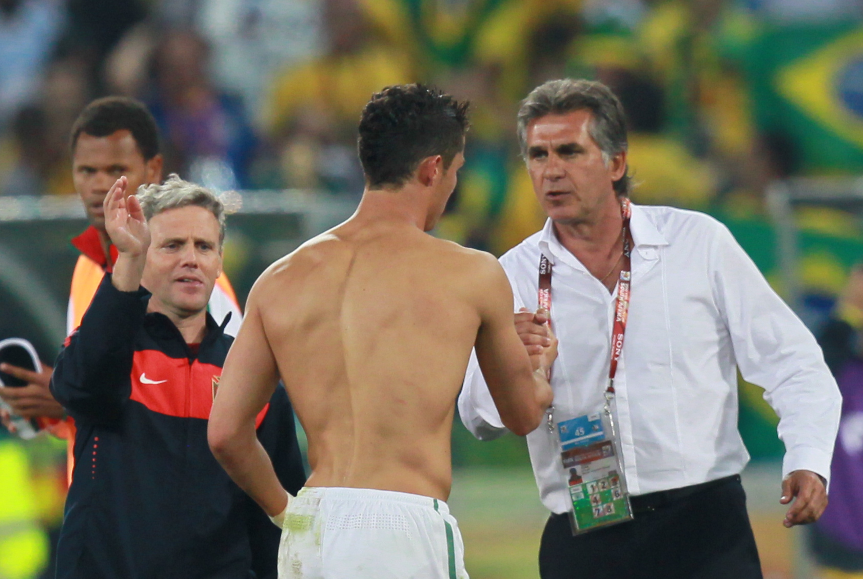 Portugal S Cristiano Ronaldo L Shakes Hands With Portugal S Headcoach Carlos Queiroz R After The 2010 World Cup Group G Soccer Match Against Brazil At Moses Mabhida Stadium In Durban June 25 2010